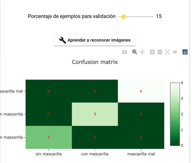 ¡Pero aún hay más! Si definimos un valor mayor que cero para el parámetr_o “Porcentaje de ejemplos para validación”_, cuando se genere el modelo al hacer clic en “Aprender a reconocer textos|imágenes|números”, aparecerá un gráfico denominado “Confusion matrix” (Matriz de confusión). Nos ofrece una medida de la calidad y precisión del modelo construido.