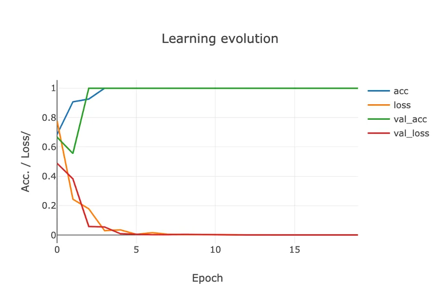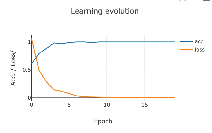 La curva azul representa la evolución de la precisión (accuracy) del modelo a medida que se va generando. Es decir, en cada una de las épocas de entrenamiento. La curva naranja representa la evolución de la función de pérdida (loss). Cuanto más próxima a 1 sea la precisión y más próxima a cero sea la función de pérdida, mejor es la calidad del modelo.