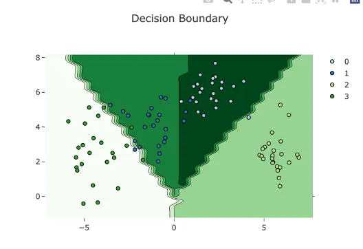 La última gráfica que ofrece el modo avanzado de LearningML es la denominada “decision boundary” (límites de decisión). Esta gráfica sólo se genera cuando el modelo es de reconocimiento de conjuntos numéricos y además, los datos de ejemplos son bidimensionales, es decir, el nº de columnas es 2.
