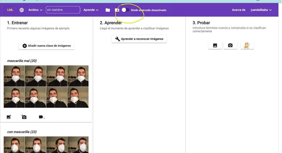 Para activar el modo avanzado de LearningML, basta con hacer clic en el botón de tipo interruptor que se encuentra en el menú principal.