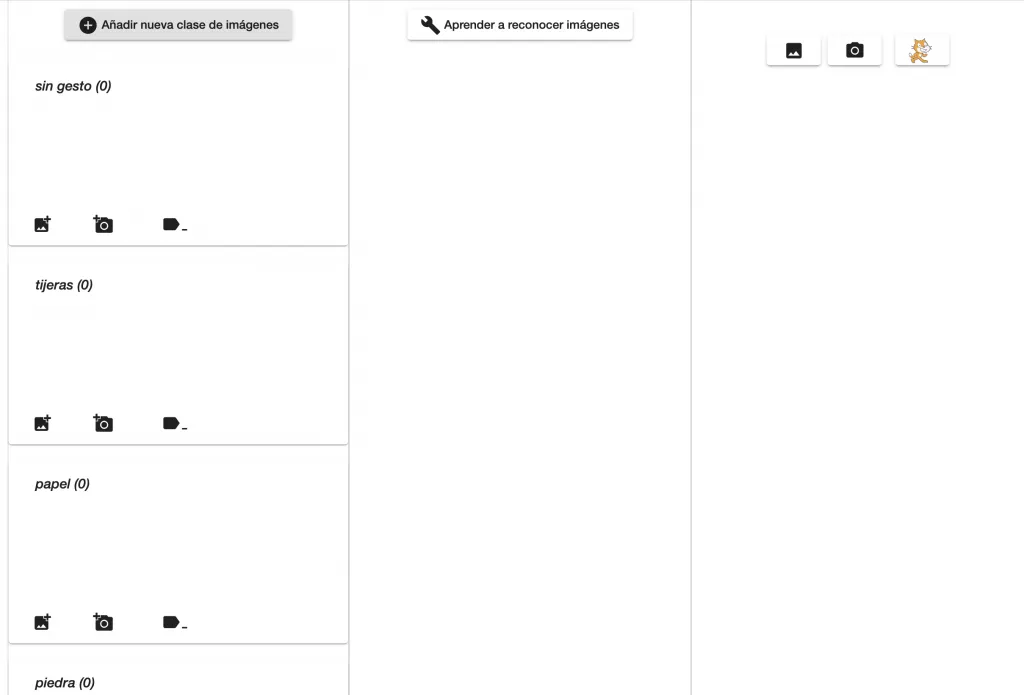 Let’s start there. By building the ML model. We open the LearningML editor and in section 1. Train, we create four classes, one for each move, which we will call rock, paper, scissors, and the fourth one to recognise the absence of gesture, which we will call no gesture. This last one will be useful for us so that the computer does not mistakenly associate one of the moves when we have not yet shown it to the camera.