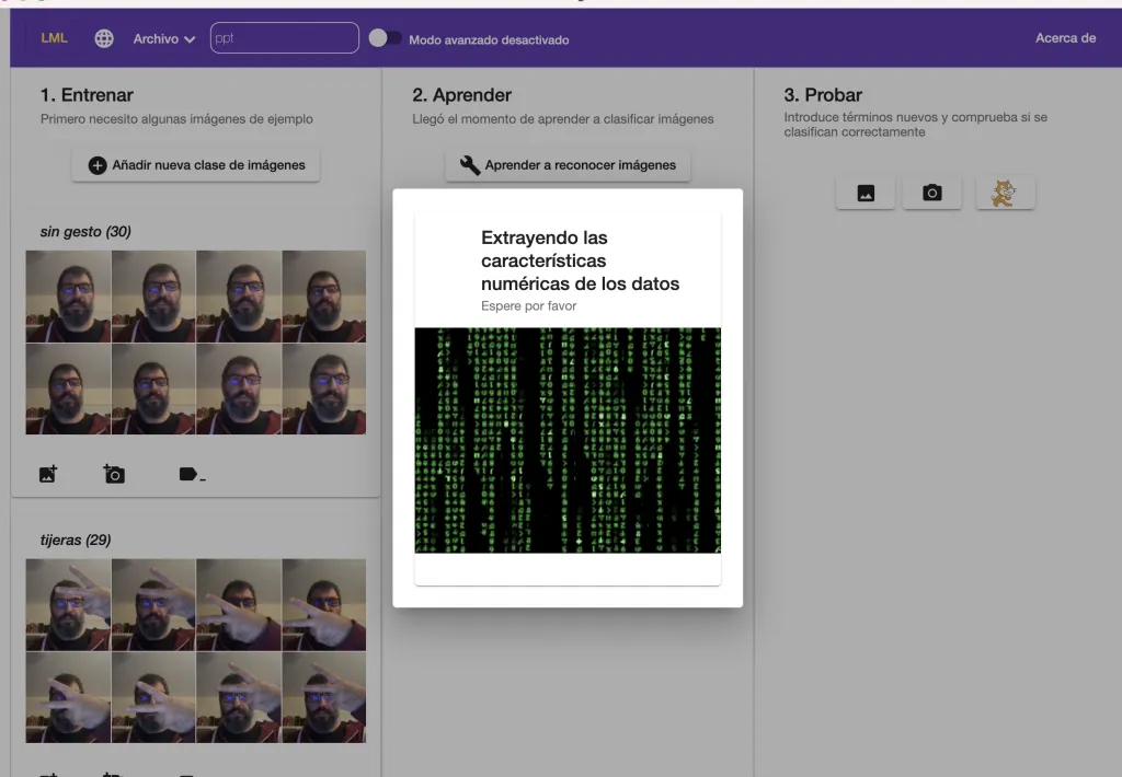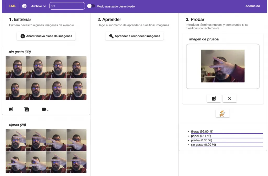 To solve that part of the problem we can create an ML model capable of recognising the three gestures of the game, and once it works correctly, we can use it, like any other block, in our videogame.