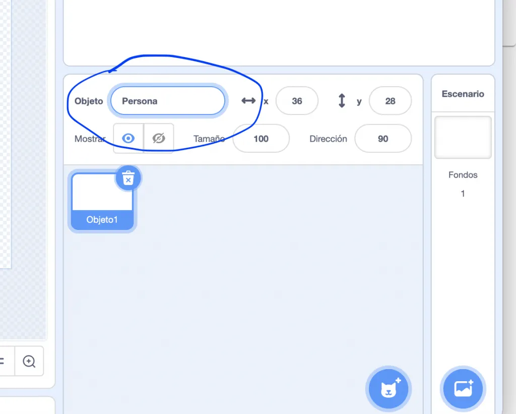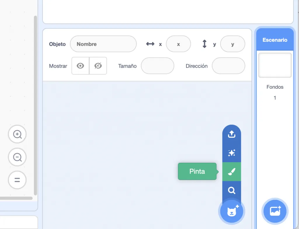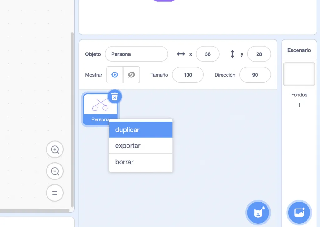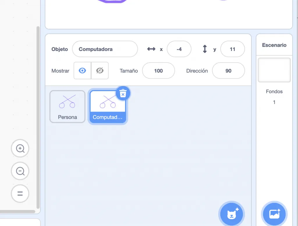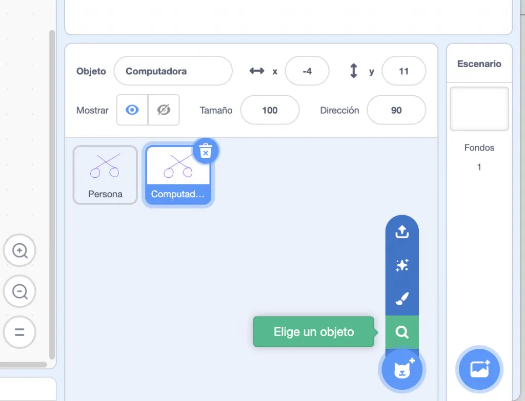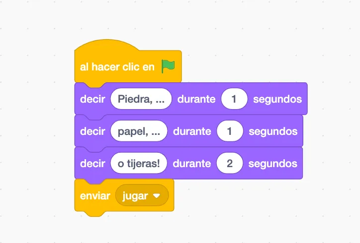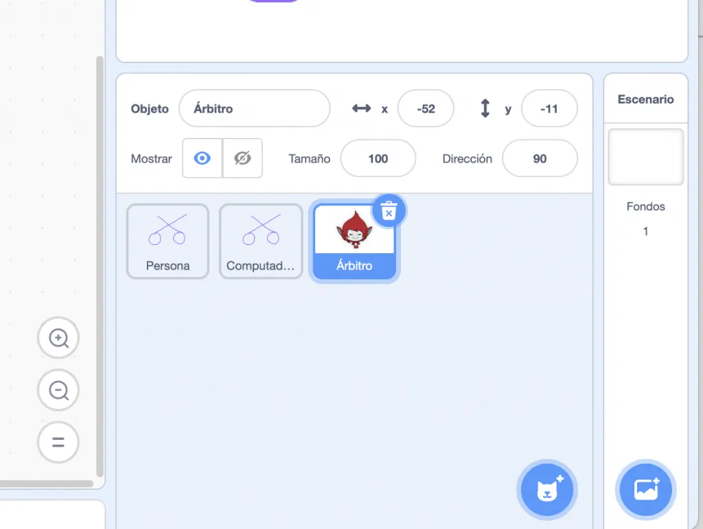 Now we click on the Scratch kitty button to start the programming platform. Once there, we will create 3 objects: one to implement the player’s actions, one for the computer’s actions and the last one for the referee.