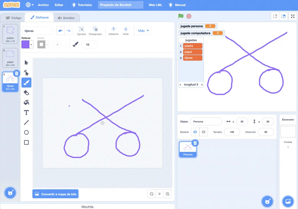 And in the disguises section of the code editor we will add three disguises named after the moves: rock, paper and scissors. In each of the disguises we will draw something that resembles a rock, a piece of paper and a scissors respectively.
