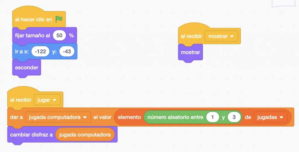 Also, when you receive the message “show”, the object will be displayed. This message will be sent by the referee when both parties have made their move. Finally, when it receives the message “to play”, the object generates a random number between 1 and 3 (both inclusive) that will be used to choose one of the elements of the list of moves, and store it in the variable computer_move. That is, this variable will end up containing one of the texts “rock”, “paper” or “scissors”.