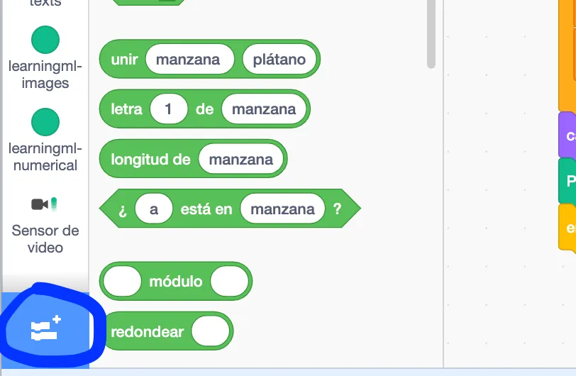 - First we set the transparency of the camera to 50%. To use this block you have to add the extension “video sensor”. Click on the button at the bottom left. The available extensions will appear, including “video sensor”. Once selected, this block is available.