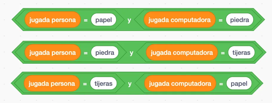 When the person presents the gesture to the camera and the exit condition of the loop has been fulfilled, we have stored in the variable play_person, the value that the ML model has interpreted on the person’s gesture. And since we have been careful to call the names of the move classes the same as the costumes, i.e. “rock”, “paper”, or “scissors”, we can use the value of the variable juagada_persona to set the costume that the Person object should display.