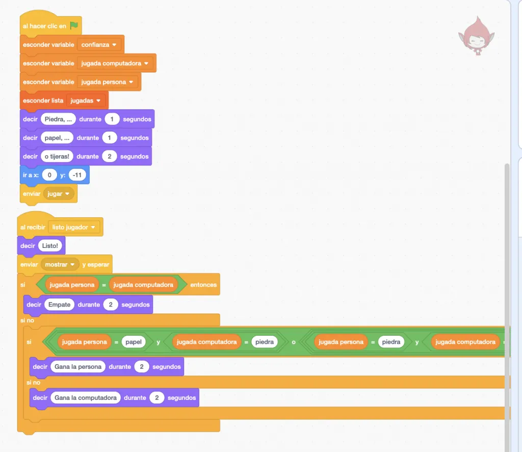 This program, as shown in the image, is very simple: first it says “Ready”, to indicate that the game is over, then it sends the message “show”, which is received by the objects Computer and Person to appear on the screen and show the disguise that corresponds to their move. And finally the game is resolved in the nested “yes - no” blocks.