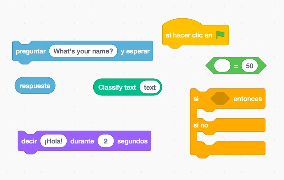 Fíjate que en la primera columna, donde aparecen los tipos de bloques, hay unos que se llaman “learningml-texts” y “l_earningml-images_”. Pincha sobre ellos y verás que contienen varios bloques nuevos. Estos bloques sirven para usar el modelo que acabas de construir hace un momento. Como has hecho un modelo de reconocimiento de textos, debes usar los bloques de la sección “learningml-texts”.