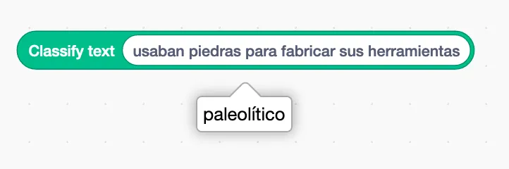 ” en la zona de programación de Scratch! y escribe en su entrada algún texto que tenga que ver con una de las órdenes de nuestro asistente. Por ejemplo: “usaban piedras para hacer sus herramientas”. Entonces pincha encima del bloque y observa lo que ocurre. Al lado del bloque aparece la clase de orden a la que pertenece el texto. Y así es, precisamente, cómo funciona ese bloque: al ejecutarse calcula la clase a la que pertenece el texto que ponemos en su entrada. Este hecho nos da la clave para construir nuestro juego de preguntas y respuestas. -