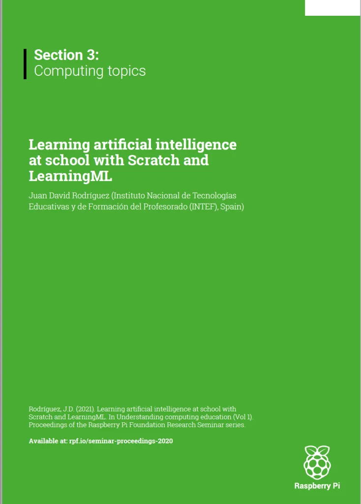 Estoy muy contento y orgulloso por haber contribuido a esta gran iniciativa con el artículo “Learning artificial intelligence at school with Scratch and LearningML”.
