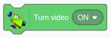Para clasificar imágenes que provienen de la cámara configurada en el navegador web, primero debes activarla con el bloque Turn video [ON]. Con este bloque puedes activar la cámara en modo normal, en modo espejo (FLIPPED) y desactivarla. Después debes pasar como argumento de los bloques de clasificación el bloque Video Image.