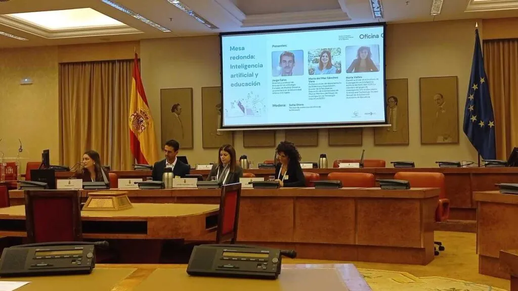 Al día siguiente tuvo lugar en el antiguo edificio del Banco de Exteriores, parte actual del Congreso, sesiones de diálogos sobre cada uno de los informes. En el de “Inteligencia artificial y educación” asistieron 6 diputados, 5 expertos colaboradores y las coordinadoras del informe. En esta sesión de trabajo, diputados y expertos, en estrecho diálogo, realizaron propuestas, resolvieron dudas y plantearon algunas preocupaciones sobre la IA y la educación.