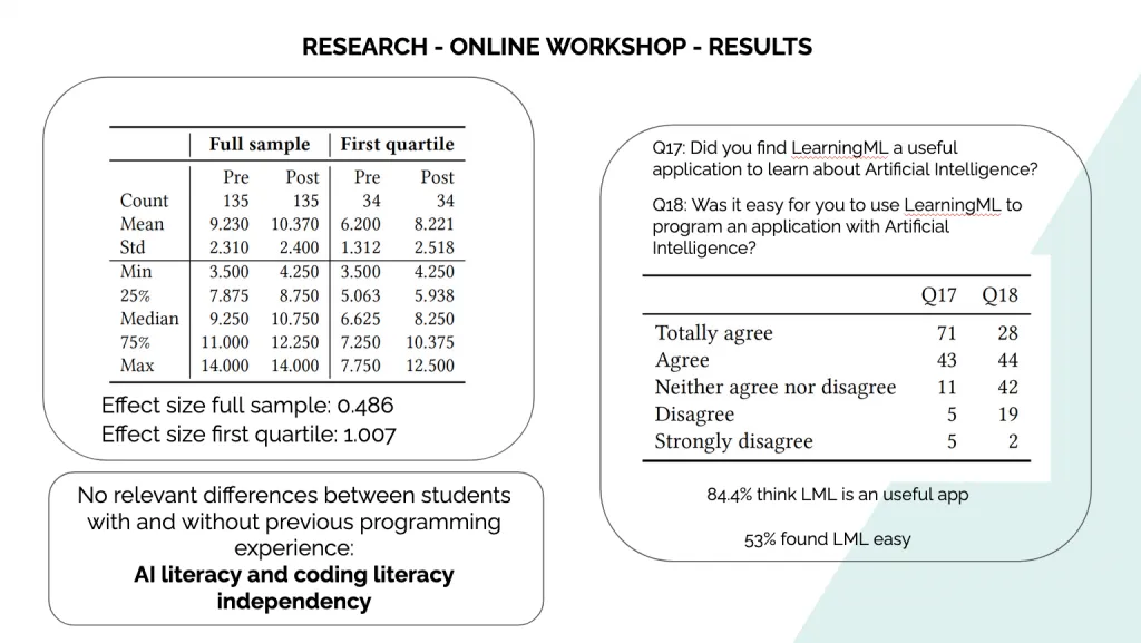 los estudiantes cambian la percepción que tienen sobre el concepto de IA. Después de usar LearningML, pasan de descripciones relacionadas con “robots” a descripciones relacionadas con _“_solución de problemas”. Es decir, se pasa de la visión idealizada, que los medios ofrecen sobre IA, a una visión más real sobre lo que es realmente la IA.